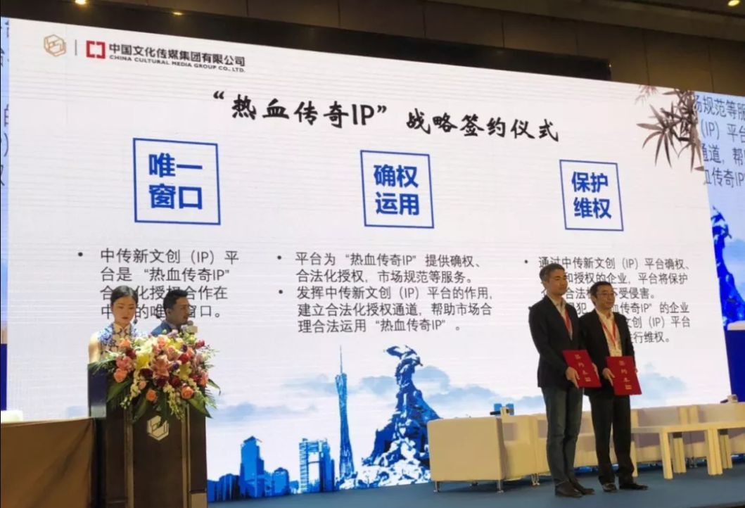 同一日,中国文化传媒新文创(IP)平台广州推介会上,中传新文创(IP)平台与娱美德的签约仪式也在此次推介会上进行了发布,双方就“热血传奇IP”在中国区域内的合法化授权合作达成战略合作。